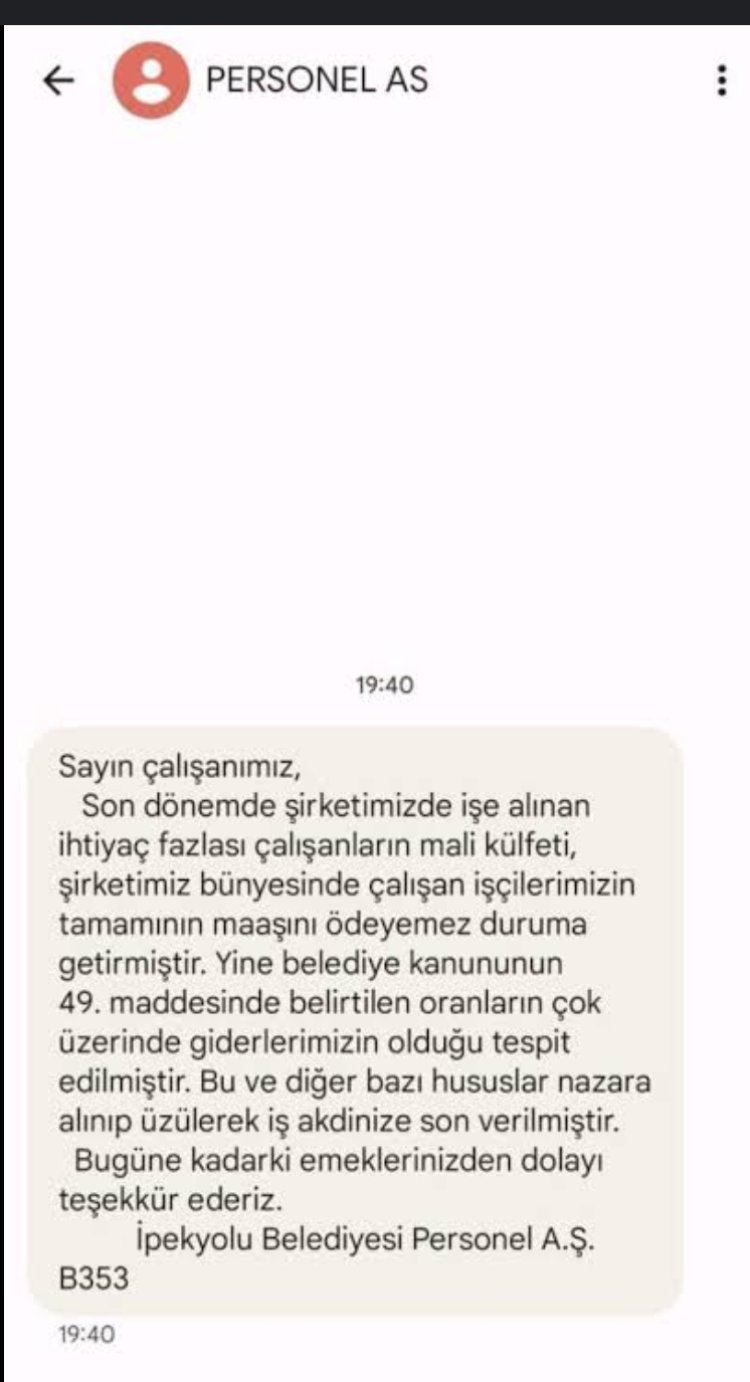 "Asla mesleki veya siyasi ayrım ve asla bir cezalandırma düşüncesi olmadan, sadece kent halkına hizmet de sunabilecek bir belediye hedefi ile son 6 ay içerisinde Belediye Şirketinde işe başlatılmış herkesin işine son verilmesine derin üzüntü yaşayarak karar vermiş bulunuyoruz" açıklamasında bulunuldu.