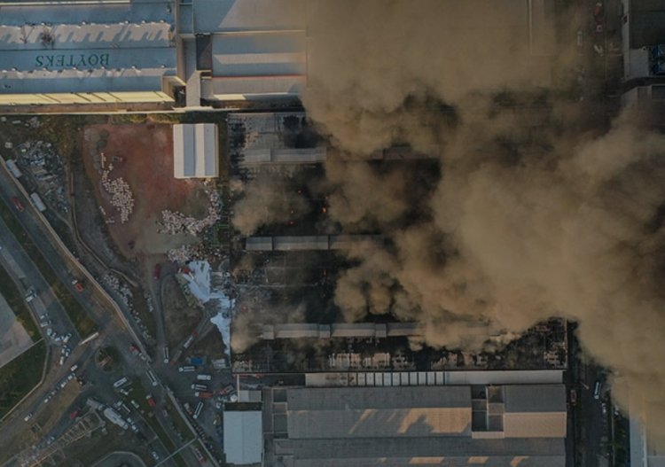 Tekstil fabrikasındaki polyester ipliklerin yanmaya devam ettiği, bölgede alev olmadığı ancak söndürme çalışmalarıyla birlikte siyah ve gri dumanların yükselmeye devam ettiği kaydedildi.