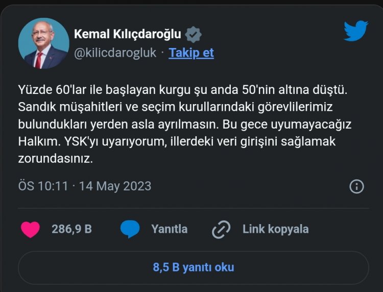 Cumhurbaşkanı adayı Kemal Kılıçdaroğlu, Twitter'dan bir açıklama yaptı. Kılıçdaroğlu, "Yüzde 60'lar ile başlayan kurgu şu anda 50'nin altına düştü. Sandık müşahitleri ve seçim kurullarındaki görevlilerimiz bulundukları yerden asla ayrılmasın. Bu gece uyumayacağız Halkım. YSK'yı uyarıyorum, illerdeki veri girişini sağlamak zorundasınız" dedi.