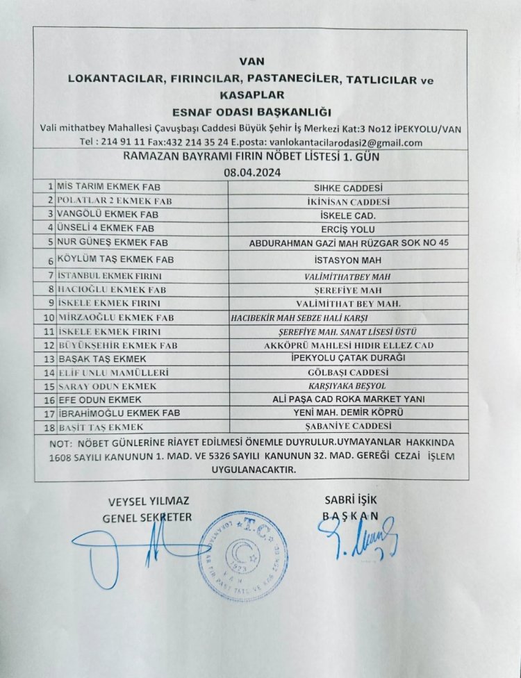 Van Lokantacılar Fırıncılar Pastaneciler Tatlıcılar ve Kasaplar Esnaf Odası, bayramın ilk 3 gününde çalışacak olan ekmek fırınlarının tam listesini paylaştı.